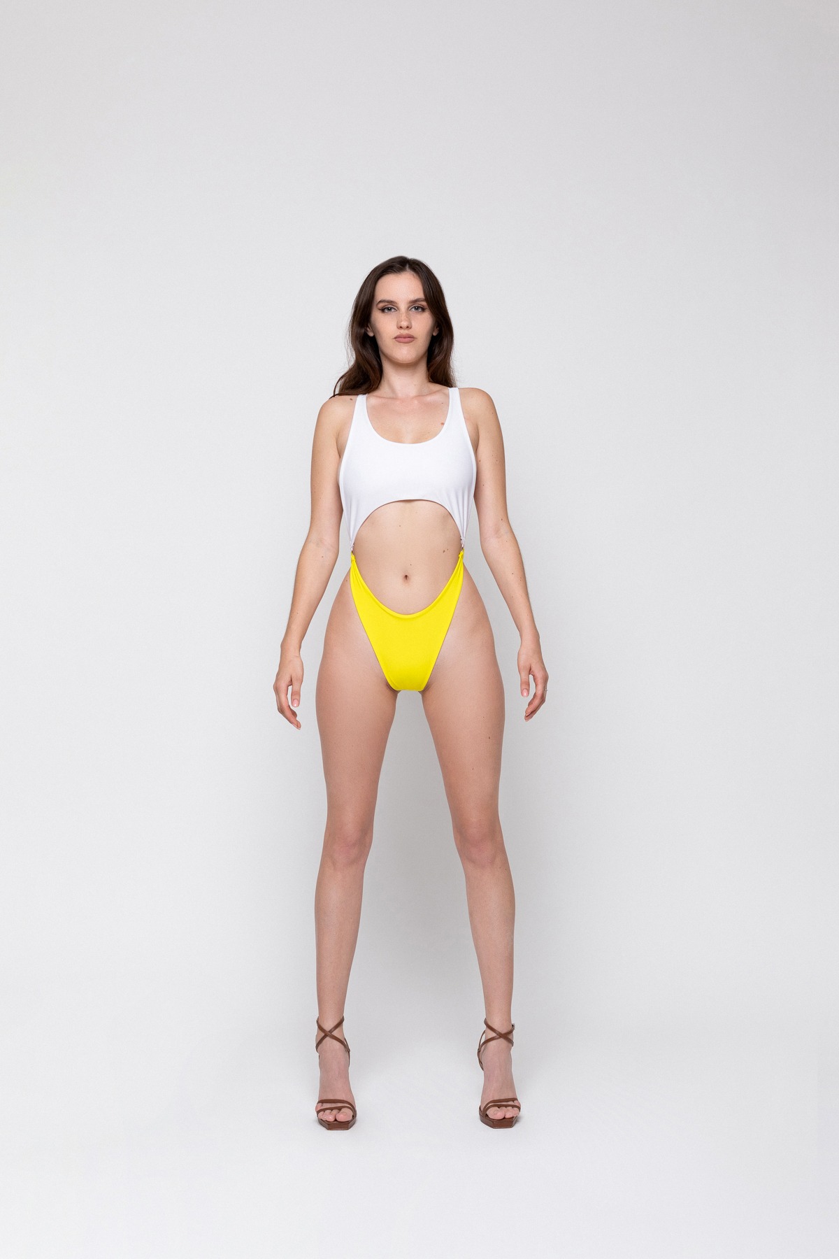Es un traje de baño de tirantes cruzados en la espalda. La parte superior es siempre de color blanco y la parte inferior cambia de color.